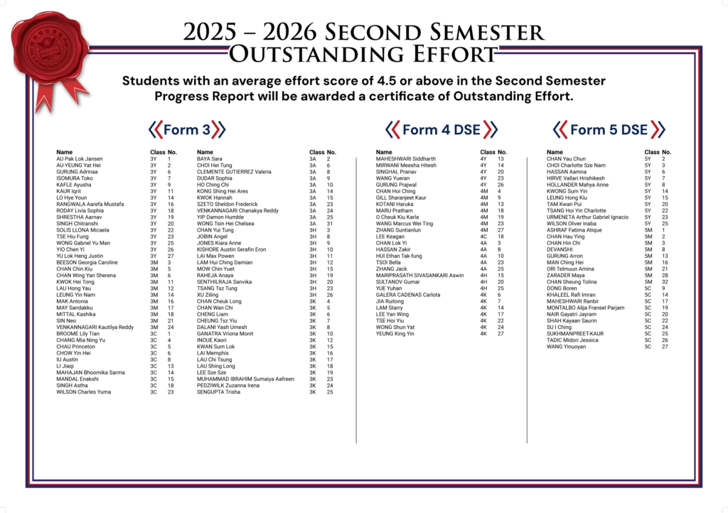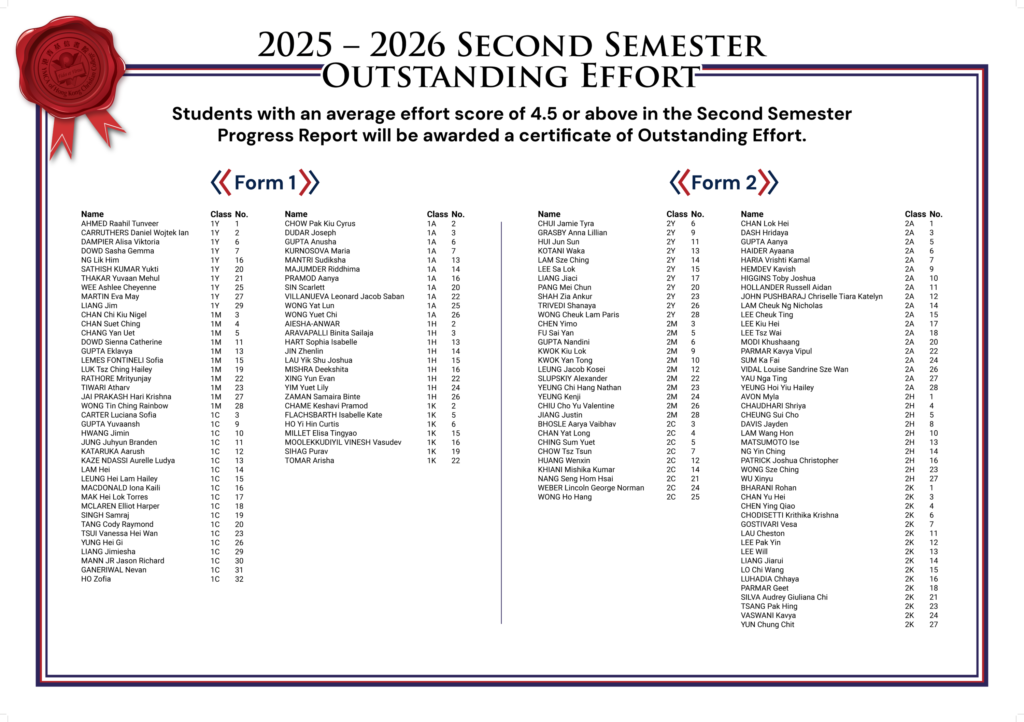 Students with an average effort score of 4.5 or above in the Second Semester Progress Report will be awarded a certificate of Outstanding Effort.
